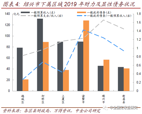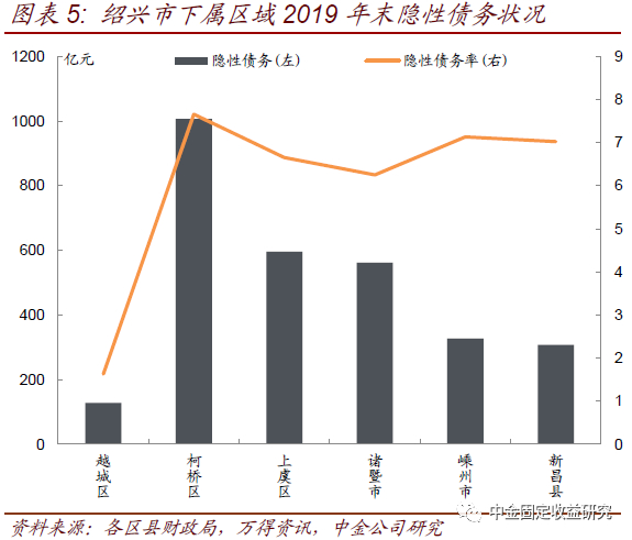 绍兴市下属区县显性债务率整体可控,其中诸暨市债务规模较大、债务负担较重,越城区债务规模较小、债务负担较轻。从显性债务的角度来看,截至2019年末诸暨市一般政府债务为128.2亿元,居绍兴市首位且为全市唯一超过100亿元的区域;同期末柯桥区以89亿元的一般债务规模居次,嵊州市、新昌县、上虞区的一般债务余额在36-60亿元区间;越城区一般债务余额21亿元,排名末位。显性债务率方面,截至2019年末诸暨市、嵊州市分别以142.8%、124.2%的一般政府债务/一般预算收入排在绍兴市前两位,主因债务规模较大或财力较弱;其余区域该比值在100%以下,其中新昌县94%较高主因财力较弱,越城区26.7%较低主因债务规模较小,总体看绍兴市显性债务率可控。
