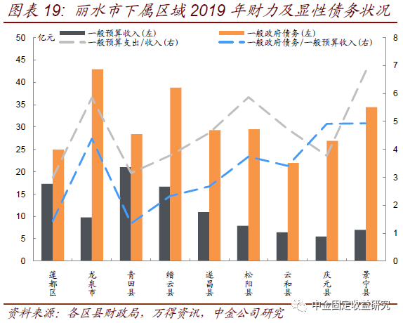 (9)丽水市:位于浙江省南部浙闽交界地区,2019年一般预算收入列全省第10位,同期末显隐性债务率分列全省第1、10位,显性债务负担重但隐性债务负担较轻。2家有存量公募债券的城投平台均为市级平台,其中丽水城投业务范围及自身规模扩大,政府支持力度较好,丽水城建自身规模不及丽水城投,好在债务负担可控。下属各区域财力规模均较小、平衡性普遍较差且显性债务负担偏重。