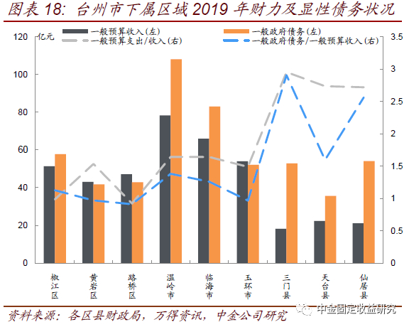 (8)台州市:位于宁波市、温州市之间,2019年一般预算收入列全省第6位,同期末显隐性债务率分列第5、7位。市级平台仅台州国资1家,为台州市最重要的综合性国资运营平台。下属区域财力状况为县级市强于市辖区,市辖区又强于市辖县,路桥区、椒江区财政平衡性佳,三门县、仙居县显性债务负担重。非市级平台11家,台州循环业务范围有限。