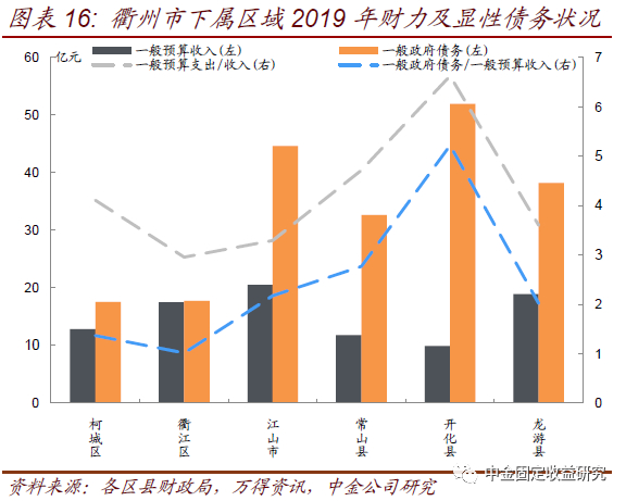 (6)衢州市:位于浙江省西南部浙皖赣闽四省交界地区,2019年一般预算收入列全省末位,同期末显隐性债务率分列全省第2、9位,显性债务负担重而隐性债务负担可控。市级平台3家,其中衢州国资业务公益性较强,区域地位重要,自身规模较大且债务负担可控,而全资子公司柯城国资、全资孙公司汇盛投资业务范围有限,自身规模较小。下属各区域财力、平衡性普遍不佳,债务负担均较重,其中开化县最弱。非市级平台仅1家,龙游国资区域地位重要,债务负担可控,但区域财力较弱。