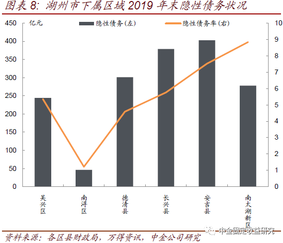 截至2019年末湖州市除南浔区外各区域的隐性债务负担均较重,其中安吉县隐性债务规模超过400亿元居首,隐性债务率高达7.5,南太湖新区因财力偏小,债务债务率高达8.8,为最高;而南浔区隐性债务规模及债务率居后。从隐性债务的角度来看,截至2019年末安吉县的隐性债务规模高达403亿元,居全市首位;同期长兴县、德清县、南太湖新区、吴兴区的隐性债务规模在240-380亿元之间,其中长兴县379亿元相对较大、吴兴区244亿元相对较小;南浔区隐性债务规模46亿元,列全市末位。隐性债务率方面,截至2019年末南浔区的隐性债务/一般预算收入比值为1.2,而湖州市其余区域该比值均在4.5以上,其中南太湖新区、安吉县分别达8.8、7.5,长兴县、吴兴区、德清县也在4.5-6区间,总体看湖州市除南浔区外各区域的隐性债务负担均较重。