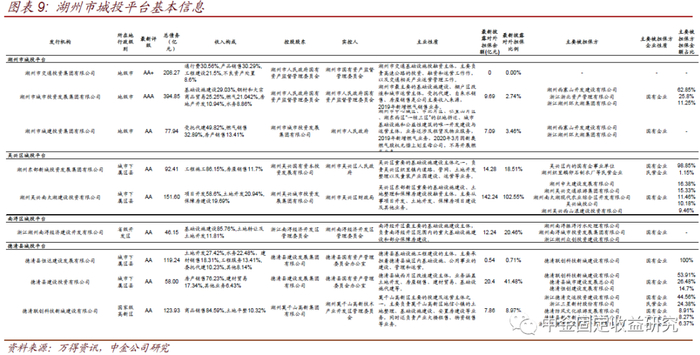 湖州市有存量公募债券的市级城投平台3家,包括湖州城投及其核心子公司湖州城建、湖州交投。湖州城建主要从事湖州市基础设施项目委托代建以及保障房建设业务,湖州城投另从事燃气、水务、贸易等业务,总体看两者主业公益性强,政府支持较好,湖州城投为湖州市最重要的基建及国资运营主体;湖州交投为全市交通基础设施建设主要平台,自身规模较大,债务负担可控。市级平台的对外担保规模均不大。截至2020年7月16日湖州市共有20家有存续公募债券的城投发行人,以控股股东为判断标准,市级平台包括湖州市城市投资发展集团有限公司(“湖州城投”)及其核心子公司湖州市城建投资集团有限公司(“湖州城建”)、湖州市交通投资集团有限公司(“湖州交投”)3家。湖州城建主要从事湖州市基础设施项目委托代建以及保障房建设业务,2019年合并湖州新奥燃气新增燃气销售业务,但2020年3月又将全部新奥燃气股权无偿划转至母公司湖州城投,剥离燃气销售业务;除上述工程代建、保障房及燃气业务外,湖州城投还从事水务及商品贸易业务。截至2019年末,湖州城投、湖州城建的净资产规模分别为350.6亿元、219.7亿元,自身规模较大,总债务/含补贴EBITDA分别为47.6和17.3,湖州城投债务负担偏重。政府支持方面,2019年湖州城建受湖州市国资委无偿划入资产35.1亿元计入资本公积,在此基础上湖州城投另收到湖州市国资委拨款33.30亿元,下属子公司湖州城投人才产业园开发管理有限公司和湖州市城投育华物产管理有限公司收到南太湖新区管理委员会拨款2.9亿元,均计入资本公积。总体看两者主业公益性强,政府支持较好,其中湖州城投为湖州市最重要的基建及国资运营主体,为湖州市“天花板”平台,湖州城建为湖州城投的核心子公司;湖州交投为全市交通基础设施建设主要平台,截至2019年末净资产规模为207.9亿元,自身规模较大,总债务/含补贴EBITDA为18.9,债务负担可控,同为湖州市“天花板”平台。对外担保方面,3家市级平台最新披露的对外担保比例均在5%以下(其中湖州交投披露无对外担保),被担保企业主要为区域内平台类国企。