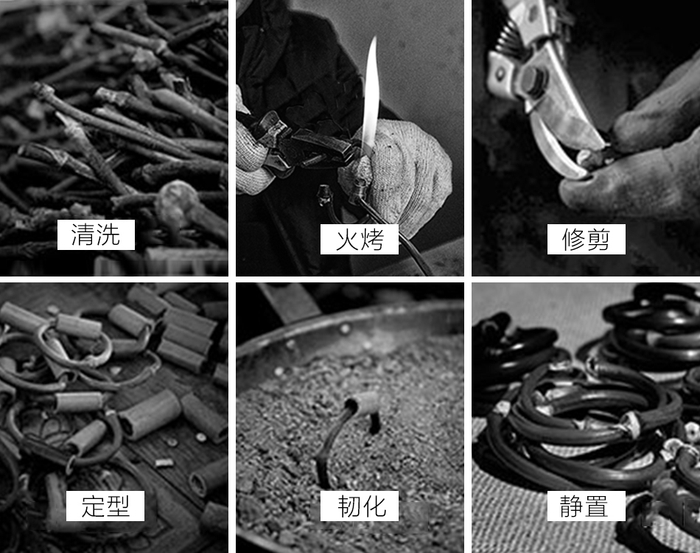 火烤:用火烤的方式,让鸡血藤软化,再用手一点点掰弯成型。