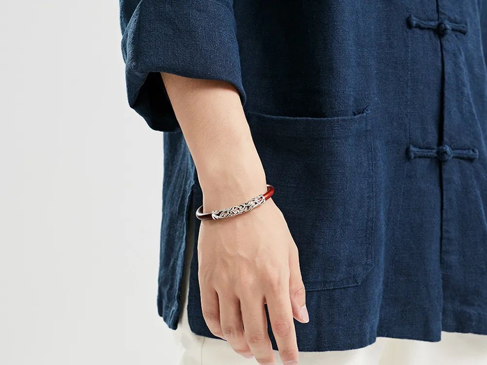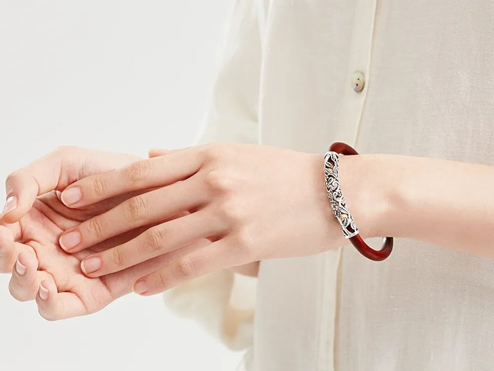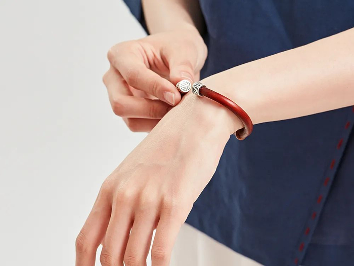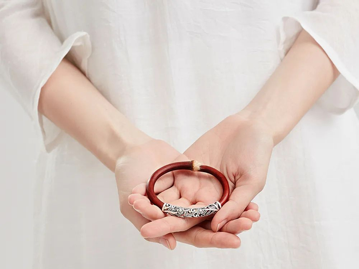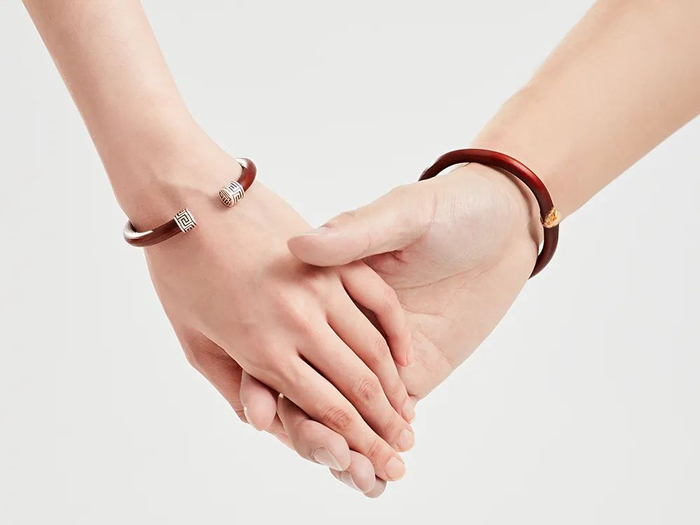 设计师将回纹,与鸡血藤镯相结合,呈现出一种“大巧若拙”的美感。