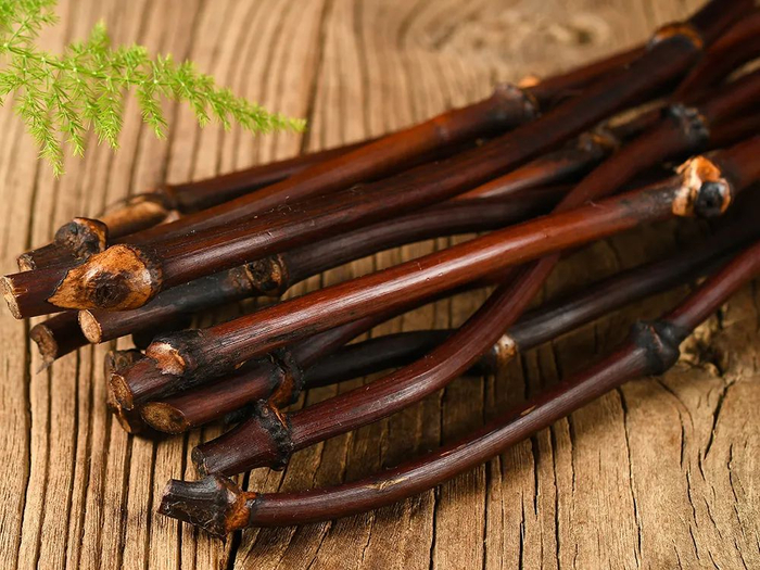 定型韧化:取三点式固定法,用绳子将鸡血藤两端绑住,或是用小竹节套在两端帮助固定。