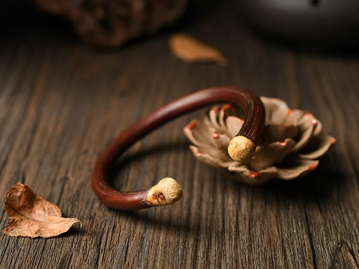 由于特立独行的节头,以及颜色和花纹的多样性,每一只鸡血藤镯都是独一无二的。