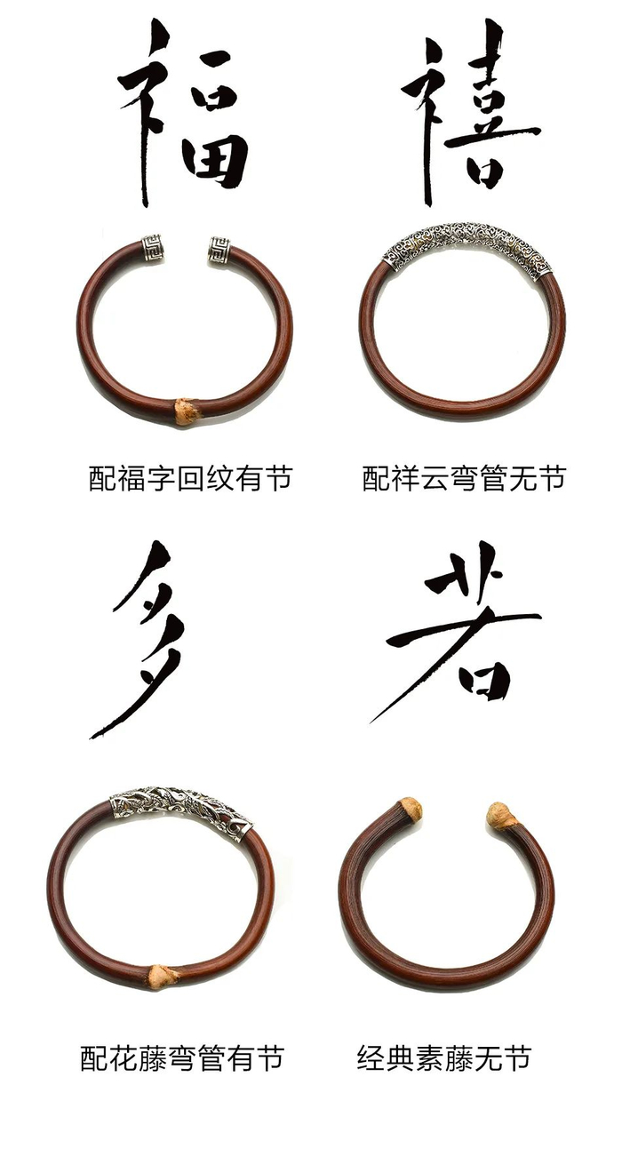 此次四款众筹的藤镯中,有三款就用到了银饰配件:配福字回纹的、配花藤的、配祥云的。