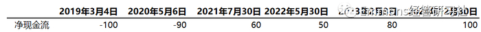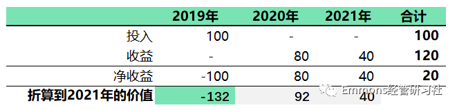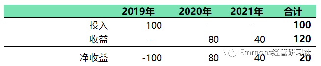 假设投资一个项目(下图),2019年底投资100亿(假装我们真的很有钱),此后两年逐步获取收益。