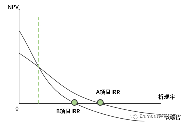 图中,A项目IRR更高,但当折现率在绿色虚线左端时,B项目的净现值更高,收益情况更好。