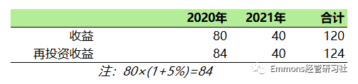 如果现实中2020年获得的80亿用于再投资,只能获得5%的收益率,明显低于IRR的14%,那么到2021年末,能获取的总收益是124(下图)
