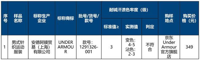 ——耐碱汗渍色牢度。耐碱汗渍色牢度是指纺织品在碱性汗液中的颜色保持程度。经测试,40件样品中,有1件样品耐碱汗渍色牢度项目不符合国家标准要求,为UNDER ARMOUR(安德玛)的男式针织运动服装。