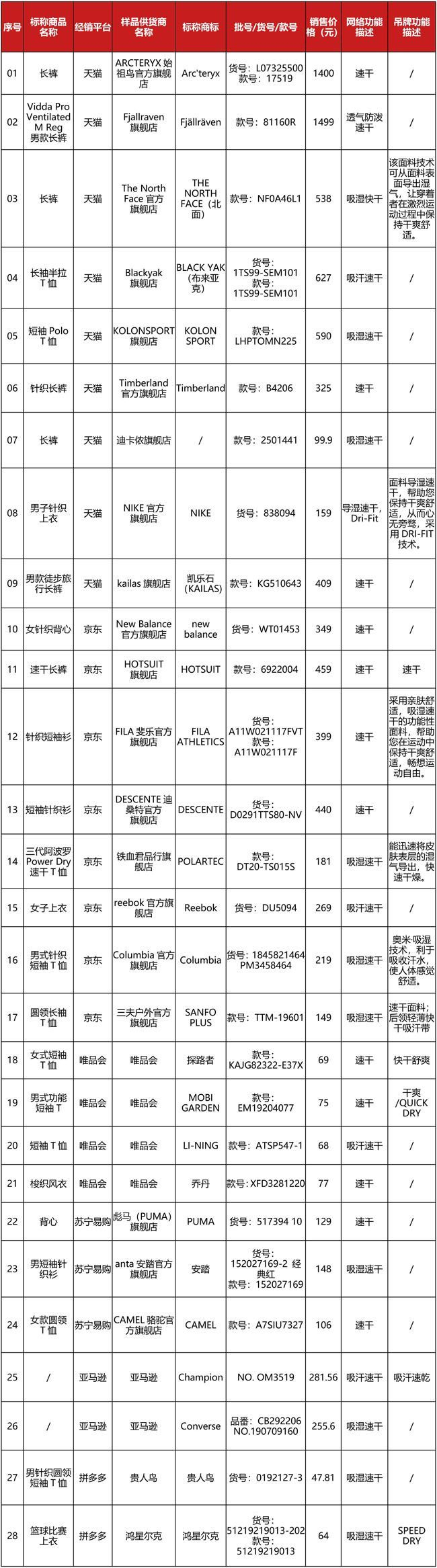 据介绍,本次比较试验样品由北京市消费者协会组织工作人员以普通消费者身份从天猫、京东、唯品会、苏宁易购、亚马逊、拼多多等电商平台购买,涉及40个品牌中销量较高的40件吸湿速干衣样品,购买价格从47.81元至1499元不等。