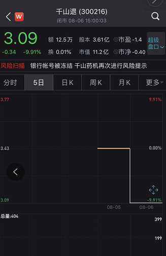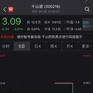 千山退(300216)复牌第二日(8月6日)股价下跌9.91%报收3.09元,成交额仅12.45万元。
