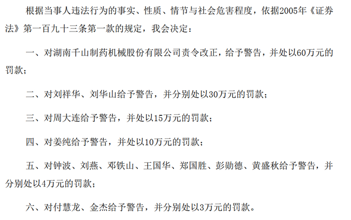 证监会认为,刘祥华伙同其胞弟刘华山,操控公司资金往来,领导、决策和组织实施千山药机信息披露违法事项,刘祥华、刘华山是千山药机上述年度报告虚假记载的直接负责主管人员,且应承担主要责任。同时,刘样华、刘华山凌驾于公司内部控制之上,领导、决策和组织实施千山药机违规发生金额巨大的关联方资金占用,涉案金额巨大,违法情节严重,也是千山药机临时报告信息披露违法行为直接负责的主管人员。