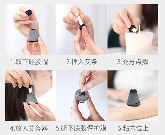 先取下上盖,插入艾条,点燃艾条后盖上上盖,撕下胶膜粘穴位上即可。
