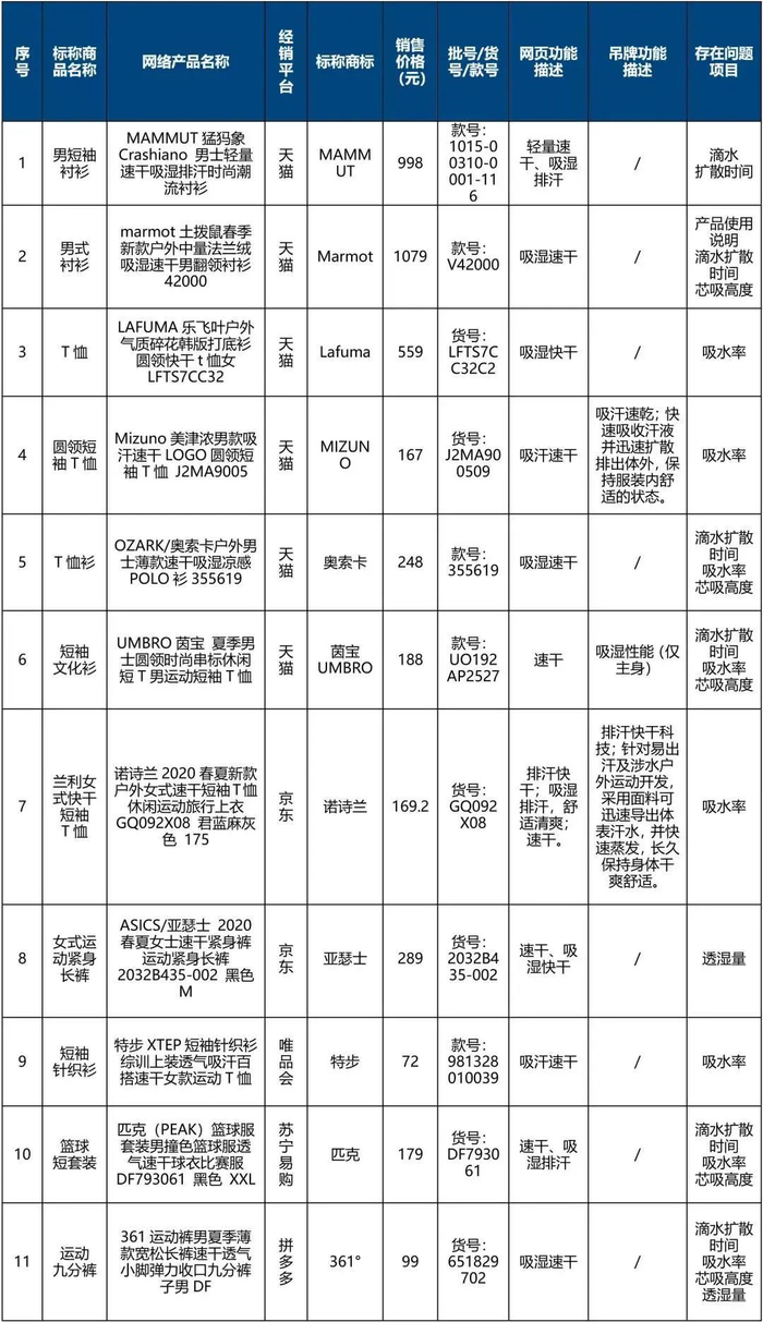 8月5日,北京市消费者协会发布了40件吸湿速干衣比较试验结果,测试结果显示,有12件存在质量问题,其中,11件样品的吸湿速干性能差,亚瑟士、特步、匹克、361°、MAMMUT猛犸象、奥索卡等多个知名品牌上榜。