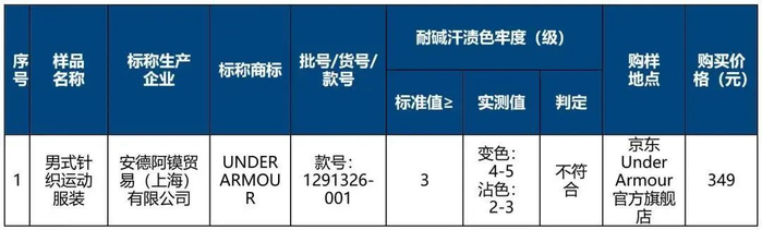 耐碱汗渍色牢度是指纺织品在碱性汗液中的颜色保持程度。经测试,美国知名高端功能性专业运动品牌Under Armour安德玛一款样品耐碱汗渍色牢度项目未达到国家标准要求。