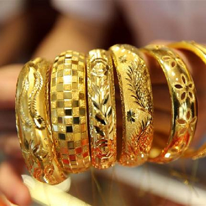 资料图:江苏连云港市赣榆区一家金店营业员在展示黄金饰品。(图片来源:视觉中国)