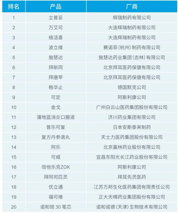 2020年第一季度零售处方药前20的药品中,立普妥、万艾可、络活喜分别位居一、二、三名。