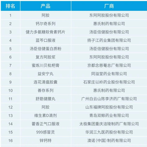 在2020年第一季度非处方药和保健品前20的药品中,前三分别是阿胶、钙尔奇、健力多氨糖软骨素钙片。受疫情推动,以岭药业的莲花清瘟胶囊上榜,增速最高,达79.5%