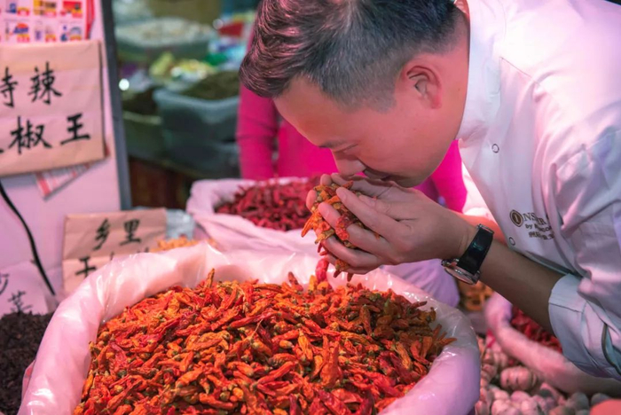 这种爱研究食材的习惯至今都没改变。在11月的那场菜场行中,摄影师们已经习惯了要时不时等一下林述巍,因为他常常会被摊位上的各种食材吸引。比如辣椒摊前摆着大红、橙黄等六七种辣椒,他就会和同行的另一位大厨把每种辣椒的特点都交流一遍,有一个不认识,他都会立刻找老板问个究竟。