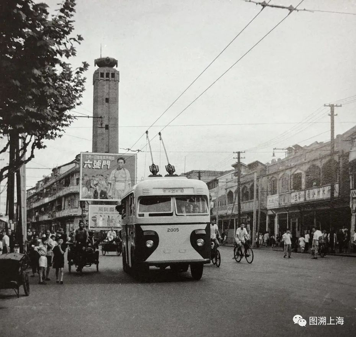 1953年开辟的21路环城无轨电车驶经老西门(背景为陈英士纪念塔)