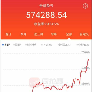 三哥展示了一个当初5w起步的账户,现在有57万,同花顺只记录了从16年到现在的收益率,这个数字是645.02%。