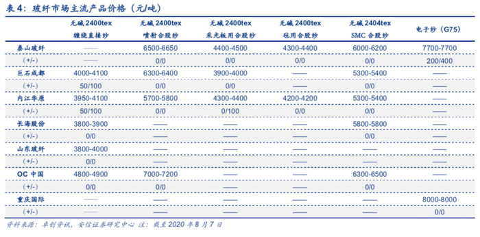 无碱纱市场:本周无碱池窑粗纱市场市场价格小幅上调,市场交投尚可。8月初,受下游需求良好提振,国内主要池窑企业价格主流产品价格有一定上调,整体涨幅50-100元/吨不等。据了解,年内风电纱产品需求利好支撑,几大主要龙头企业产品结构有一定调整,风电纱产量有所增加,而随着8月份来临,终端市场逐步复苏,基建工程基本开工,对缠绕纱需求量逐步加大,加之前期部分产线冷修和停产,总供应量有所减少,整体供需关系良好,缠绕直接纱价格有所上调。当前主流产品2400tex缠绕直接纱价格保持4000-4200元/吨不等,实际成交存在灵活政策,部分企业送到价格受成本影响报价较高,实际成交按合同。