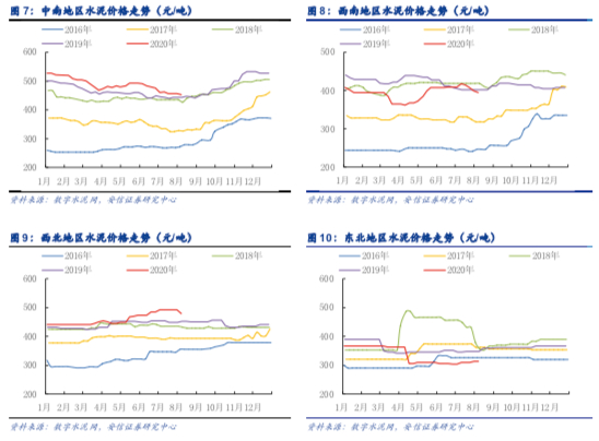 基建投资降幅收窄,房地产投资增速转正。根据国家统计局数据,1-6月份基础设施投资同比下降2.7%,降幅较1-5月份收窄3.6pct;1-6月份,全国房地产开发投资同比上升1.9%,而1-5月份同比增速为-0.3%。2020年1-6月,累计水泥产量约10亿吨,同比下降4.8%;6月水泥产量约2.3亿吨,环比下降8.1%,同比上升8.4%。受高温和雨季影响,南方地区水泥需求疲软,价格低迷,单6月水泥产量季节性回调,但单月产量仍居同期高位。7月底,随着南方雨季进入尾声,水泥需求有望底部回升。目前持续强降雨天气已经结束,后期虽然仍会有少量雨水天气以及高温、台风的短暂影响,但将弱于前期。发货量将会逐步提升。进入8月,部分地区或将提前迎来价格恢复性上调,建议关注水泥涨价行情。