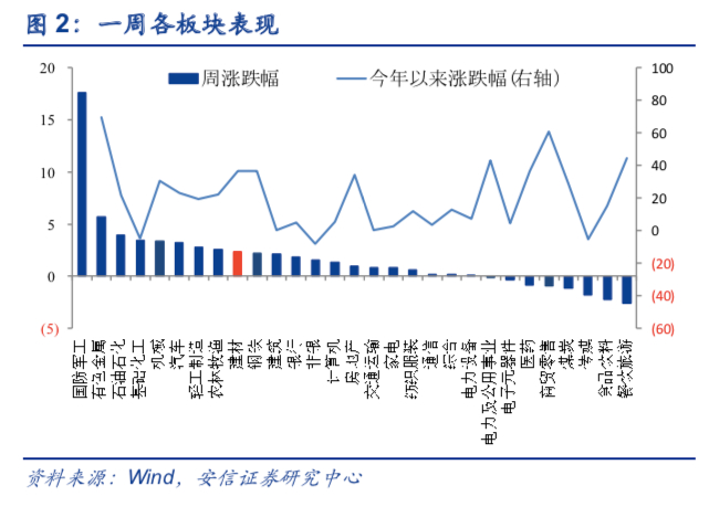 本周中信建材指数上涨2.32%,上证综指上涨1.33%,深证成指上涨0.08%,创业板指下降1.63%。本周国防军工、有色金属、石油石化、基础化工、机械涨幅居前。