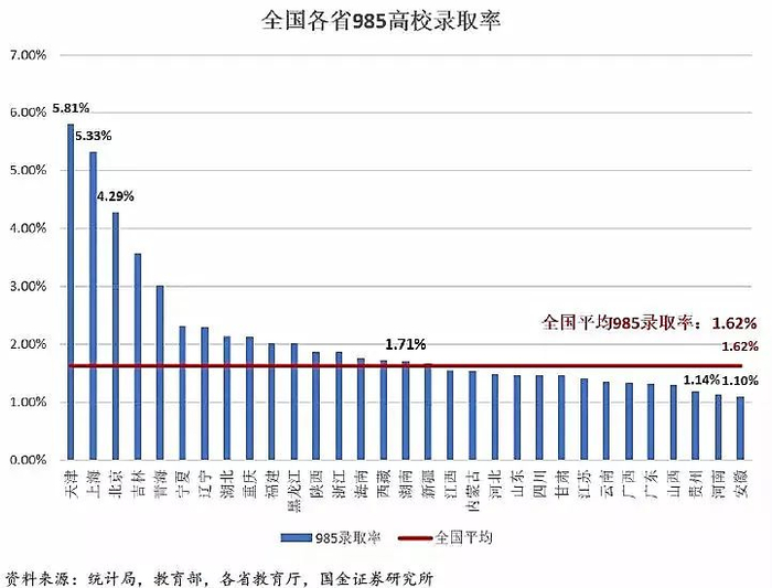 985录取率:指该省所有高考考生中,被985高校录取的人数比例。全国平均大约是1.62%(这个是所有高考考生为分母,而不是所有高考适龄人口做分母)。