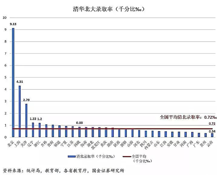 北京的清北录取率9.1‰,而云南的清北录取率近0.34‰,相差二十几倍。这和清华北大本身在北京当然也有一定关系。