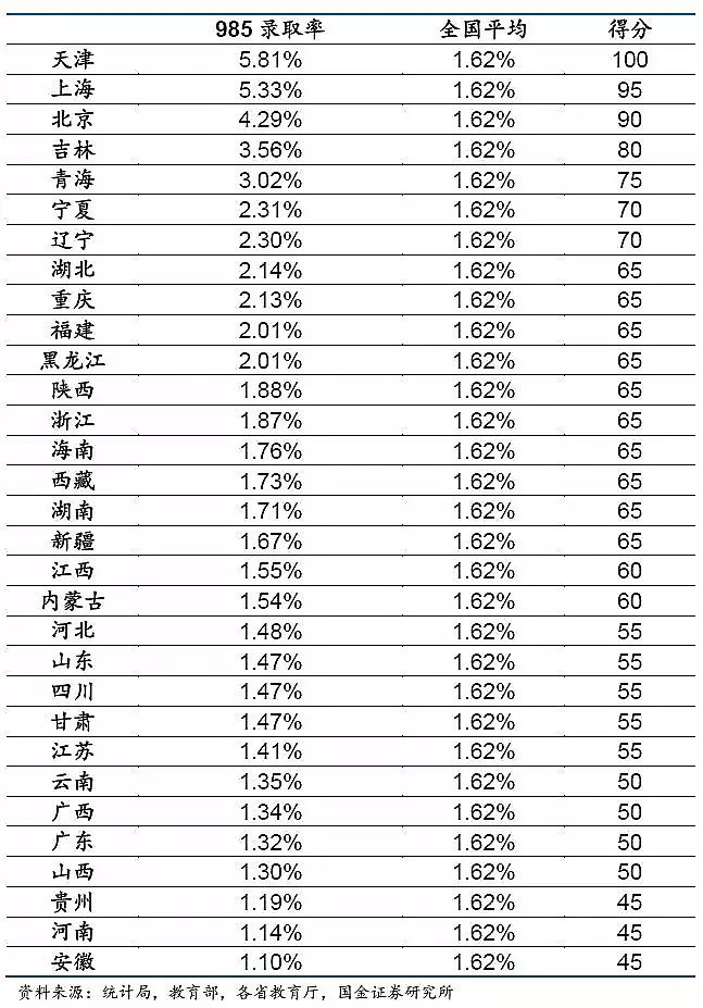录取率是一个相当可测可比的指标,不管该地区好学校多寡,人口多寡,录取率总是一个比较客观可比的因素。我好学校少,但985整体录取率(考取率)高也行啊,我人少,但是别的学校给我们名额也相对更少,也没用,所以“录取率”是更客观可比的指标。