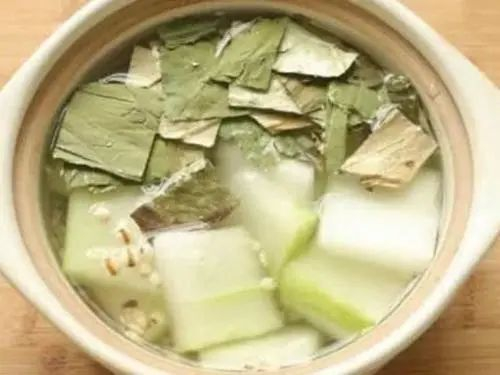 制作方法:荷叶、冬瓜一起放入锅内,加水煲汤,熟后食盐调味即可