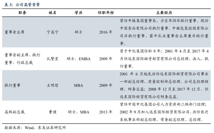公司管理层经验丰富,带动公司稳定良性发展。公司董事会主席宁高宁为硕士,1959年生,2016年任公司非执行董事、中化集团董事长,曾任中粮集团、华润集团高管,具有丰富的企业管理经验。董事会副主席、执行董事、行政总裁孔繁星获对外经济贸易大学硕士和北京大学光华管理学院EMBA学位,1964年生,2009年任职,曾于中化集团任职9年,2001年4月,担任远东国际租赁有限公司总经理,并将公司总部从沈阳南迁至上海,开始了公司产业布局阶段;2008年后,带领公司逐步形成以融资租赁为主,多元化运营为辅的集团化管控模式。