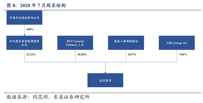 公司背靠大型央企,控股股东影响力强。远东宏信于1991年成立,由来自中、日、韩的五方股东共同出资设立,是当时注册资金最大的合资型第三方融资租赁公司。2000年,通过一系列重组,中国中化集团全资控股了远东租赁。截至2020年7月,公司第一大股东为中化资本投资管理有限公司,持股23.22%,是中国中化完全控股子公司。中国中化是我国领先的石油和化工产业综合运营商、农业投入品和现代农业服务一体化运营企业,并在城市开发运营和非银行金融领域具有较强的影响力,2019年分别实现营收与净利润5863亿元、133.6亿元,营收排名位列世界企业88位,石化领域市占率稳居国内前四。股东背景强大,战略规划能力,以及资源整合能力将对远东宏信产生积极影响。