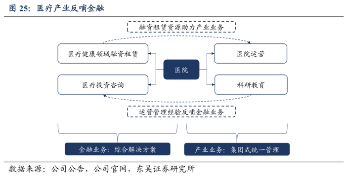 产业反哺金融,协同效应利于持续发展。公司的“金融+产业”双轮驱动模式具有明显的协同效应,由融资租赁业务衍生出产业运营业务,产业运营的经营又进一步反哺金融服务,产融结合一体化发展,以产业领域为区分构建事业部,服务更加专业、运营效率更高。以医院为例,金融端提供医疗融资租赁及投资咨询服务,积累的资源帮助公司开拓产业端的医院运营业务,医院的学科建设和管理经验又为咨询服务提供强有力的动能。医疗领域一体化运营平台的成功管理经验可以复制到建设、教育等其他产业领域,金融与产业双翼展开的模式下,公司业务形成良性循环,有利于企业可持续发展。