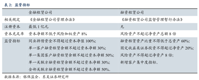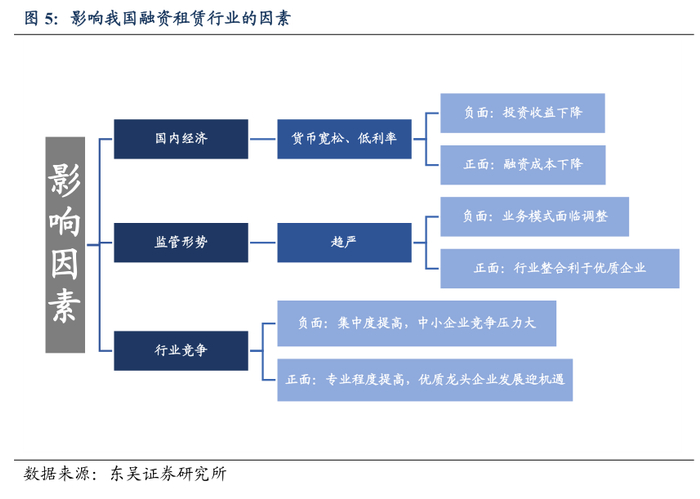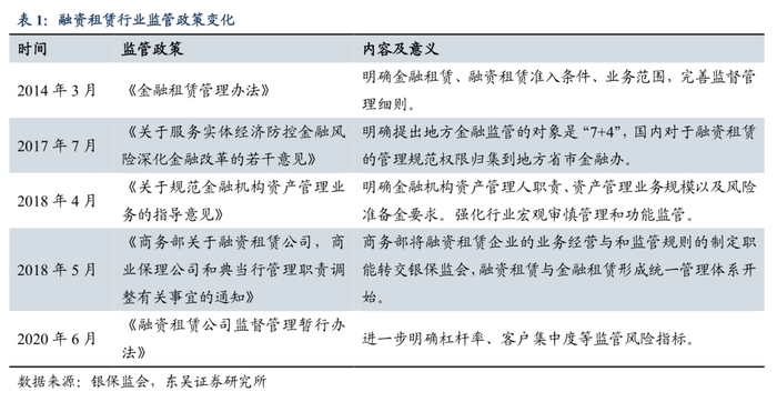 经济政策、监管形势促进行业规范化专业化发展。1)低利率、货币宽松既是机遇也是挑战。2020年以来,降准降息、广义货币供应量增速“明显高于去年”,有利于融资租赁公司获得更大规模的资金,资金利率水平也将相应降低;但同时也必然要面对投放端资金收益降低所带来的挑战,融资租赁公司将面临着客户要求降息或提前还款以置换为成本较低资金的情况,对于那些以利差为主要盈利来源的融资租赁公司来说,未来更加灵活适度的货币政策以及降准降息所带来的影响是多方面的。2)监管趋严,利于优质企业良性发展。2018年之前,金融租赁(以自有资金进行抵押放贷)公司受银保监会监管,监管尺度较严;而融资租赁公司受商务部监管,监管力度较宽松。2018年5月,商务部将融资租赁企业的业务经营与和监管规则的制定职能转交银保监会,标志着融资租赁与金融租赁形成统一管理体系的开始,各地方金融监管局逐步开展企业现场检查工作,一系列更为严格的指导方案也陆续出台。2020年,监管迎来进一步加强,推动行业“减量增质”规范化经营。6月,银保监会发布的《融资租赁公司监督管理暂行办法》正式落地。该办法将行业按风险精准分类,并具体增加了融资租赁资产比重不得低于总资产60%,固定收益类证券投资不得超过净资产20%,风险资产不得超过净资产8倍,以及维持客户集中度和关联度上限等审慎监管指标内容。监管趋严的背景下,行业或迎来洗盘,一批质量较差的中小企业将被淘汰,而优质企业则会受益;此外监管趋严对于防范行业金融风险,整合行业金融资源有积极作用。