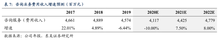 预计咨询业务保持优势,业绩增速逐步提升。咨询业务为公司优势业务之一,在所涉及的特定领域已经积累了稳固的客户与较为丰富的经验,公司专业能力将继续助力增强客户粘性。2019年由于降杠杆,资产规模调整,咨询业务收入增速出现-6.44%的负增长值,2020年实体经济承压下咨询业务仍会面临压力,但考虑到公司过去在该类业务的优异表现,预计将在未来将提高费用收入,2020年、2021年、2022年增速分别为-10%、7.5%、8%。