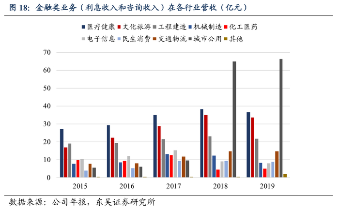 4)医疗、文旅为优势所在,城市公用近年势头强劲。公司以行业分部模式开展金融业务,专业优势显著。从行业来看,医疗与文旅(教育)为传统优势行业,融资租赁业务发展顺利,其原因在于行业的弱周期性,公司具备实力在行业内持续深耕,抗风险能力强。2019年,金融类业务在医疗与文旅上分别获得36.7亿元、33.5亿元的利息及咨询业务收入;近两年,城市公共事业发展迅猛,2018年与2019年在该行业内分别斩获65.06亿元、66.24亿元的利息及咨询业务收入,公司在基建、公用设备方面快速抢占市场份额。