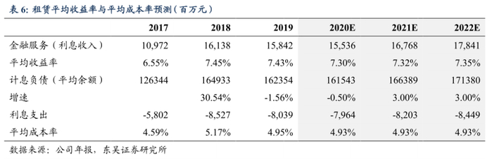 预计生息资产规模仍将稳定攀升。生息资产规模直接影响到租赁业务的利息收入,2013~2019年生息资产平均余额由692亿元升至2133亿元,复合增长率达到20.6%。2019年集团持续挖掘产业客户需求并通过证券化加快生息资产周转,促进杠杆比率继续下降,总体抗风险能力进一步得到有效提升。考虑到公司在医疗与教育领域拥有传统优势,城市公共事业领域业绩增长迅猛,预计2020年、2021年、2022年公司生息资产规模增速为9.5%、5.9%、6.0%。