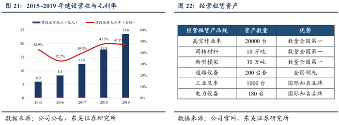 2)建设产业资产规模全国第一,构成设备运营服务的稳定支撑。公司建设产业业务开展主体为子公司宏信建发,主要形式为以建设领域设备的经营租赁为主的一站式全系列设备运营服务,营收稳步增长且保持较高的毛利率,2019年实现建设运营收入24亿元,毛利率47%。截止2019年末,公司设备运营板块的资产规模已经达到90亿元,同比增长31%,其中固定资产占比为62%,经营租赁设备种类齐全、数量充足。公司境内境外业务布局联动,拥有4家运营基地,近150家营业店,覆盖200个城市,服务2万家客户。服务包括港珠澳大桥、北京大兴国际机场、国家体育馆鸟巢在内的众多重要项目。公司建设产业运营的规模较大、项目质量高,发展空间良好。