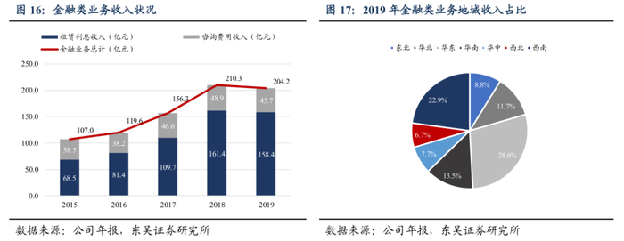 2)融资租赁业务为主,咨询业务为辅,金融整体业绩平稳向上。融资租赁以利息收入为主要盈利来源,而咨询业务以收取相关行业服务费为盈利模式。从业绩结构上看,公司融资租赁的利息收入为金融类业务的营收主力,2019年租赁服务的利息收入达到158.4亿元,咨询服务的费用收入为45.7亿元;整体业绩来看,金融类业务在总体营收呈上升趋势,2015年-2019年复合增长率为13.8%。
