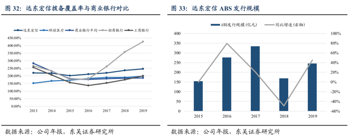 行业去杠杆背景下,远东宏信主动调节资产规模,优化资本效率。到2019年年底,远东70%的生息资产采用固定利息,利率波动影响得到缓冲。实体经济下行压力下,公司通过在客户端适当降低服务费的方式维持高端客户的商业机会,维持息差稳定。同时,公司还灵活运用ABS调整资本结构,及时出售低收益项目管理现金流,截至2019年末,发行规模达246亿元,位于同行业公司前列,并于2019年获上交所颁发的“资产证券化业务优秀参与机构”。除了主动管理资产规模,公司还上调了拨备覆盖率,从18年年末的236%上调至246%。而从15年开始,公司的拨备覆盖率保持高于同行业和商业银行平均水平。高拨备覆盖率在维护信用评级降低融资成本的同时,提高了公司发展的稳定性和可持续性。