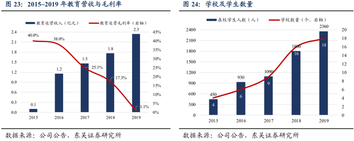 3)布局K12业务,打造高端教育体系。公司全面布局K12教育业务,致力于打造中西融合的精英教育,教育运营收入保持增长态势,2019年实现营收2.3亿元,同比增长32.8%。截止2019年末,公司已运营15所幼儿园和3所学校。但由于公司的教育业务还处于投入阶段,近年来教育运营的毛利率有所下降,主要是因为新运营项目的人力、租赁、装修等成本较高,拉低了整体毛利率。预计随着教育业务趋于成熟,师资水平的不断提高,运营流程的进一步优化,此版块的毛利率将恢复至较高水平。