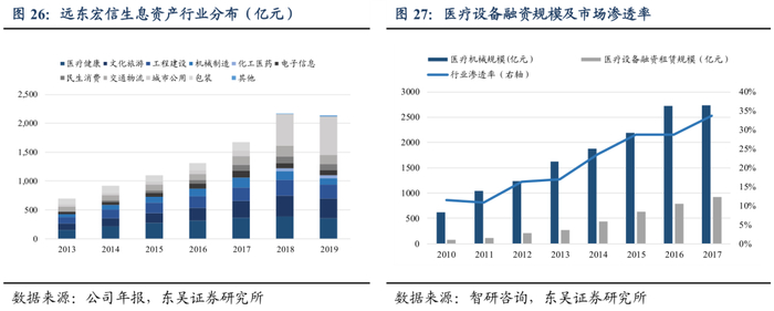 作为租赁龙头,远东宏信以其灵活的行业发展战略和专业化程度在实体经济承压下保持自身发展节奏。1)从产业结构看,除了坚持公司最为核心和优势的医疗,教育板块,远东基于行业发展趋势加大了城市公用业务的投入。2019年年末,城市公用领域生息资产占31%,居公司生息资产首位。占比逐渐升高的弱周期行业业务提高了公司整体抵抗行业波动和经济下行风险的能力和盈利的成长性。2)同时,多年专业化运营也让远东在医疗,城市公用租赁市场中占领了绝对优势。医疗租赁方面,近年来医疗设备使用规模不断增大,租赁的市场渗透率也稳步提升。行业看,远东和环球医疗已形成了明显寡头趋势,专业化壁垒提高,行业集中度有进一步加深的可能。工程建设和城市公用方面,作为集团设立的设备综合运营服务商,宏信建发在2019年实现净利润同比增长205%,累计服务客户数量超过2万家,总经营性资产原值居全国首位,并参与了港珠澳大桥,大兴国际机场等大型工程建设。公司专业化的优势在大基建的背景下愈发明显。