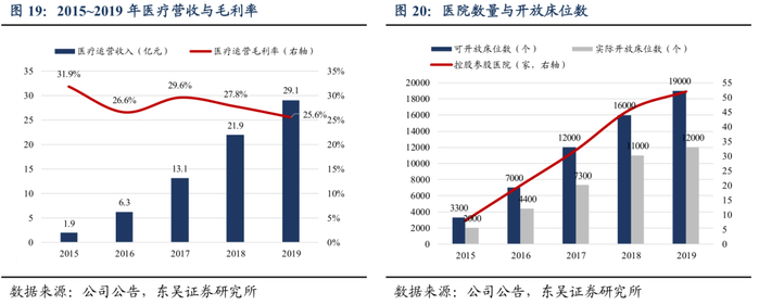 1)差异化竞争策略助力公司不断拓展医疗产业。公司医疗产业由医院运营构成主要收入来源,营收逐年提升,2019年实现医疗运营收入29亿元,毛利率保持在25%以上,床位数及医院数量不断增加,规模逐步扩大,现已达到辐射人口1亿人,医护人员1万名,日均门诊量1万人次,形成规模效应。公司在三、四线城市差异化布局,构成公立医疗体系的重要补充,且避开与公立大型医院的正面竞争。公司秉承“医教研一体”的系统性配套经营理念,不断引进先进设备和人才提升医疗水平,并进一步拓展高端康复养老服务。部分医院尚处于前期投入阶段,随着医院及床位数量的进一步增加,医疗经营服务领域的不断拓展,以及参控股医院的成熟化发展,公司医疗产业的业绩有望进一步提高。