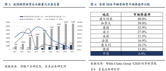 我国融资租赁行业发展迅速,前景广阔。我国融资租赁在2010-2015年间迎来高速发展,企业数量与市场业务总量的复合增长率分别高达68.9%和33.6%;而2016-2019年间发展增速放缓,两项数据分别仅有14.2%和5.7%,截至2019年,我国共有12130家融资租赁企业,业务总量达到了66540亿元。根据《2020世界租赁报告》披露的2018年数据来看,与发达国家相比我国融资租赁市场渗透率仍处低位,欧美等发达国家融资租赁行业的市场渗透率大约在15%-40%之间,是除银行信贷以外的第二大融资方式。像租赁行业最为发达的英国,融资租赁的市场渗透率已经达到32.9%。而截至2019年,我国融资租赁渗透率即使较2010年上升了376%,也仅有11.9%。因此,对照国际先进租赁市场,我国的融资租赁行业仍然具备较大的发展空间。