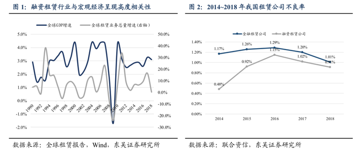 融资租赁行业与宏观经济呈现高度相关性,业内企业经营与偿债能力受影响较大。1)从全球数据来看,租赁市场在次贷危机后迅速回暖。1997年亚洲金融危机使得业务总量增速小幅下滑;2007年金融危机的爆发使各地区租赁业规模出现负增长,近年由于经济逐步复苏,租赁业务增速在2016年恢复至16.6%的水平;考虑到2020年全球疫情导致经济下滑,租赁行业增速预计将再次下滑。2)实体经济波动对承租人经营和偿债能力影响较大,进而传导到租赁行业,直观地反应在租赁企业资产质量上。2016年我国因为实体经济低迷,部分工业行业产能过剩等问题的集中爆发,租赁企业不良资产率上升明显。2017年以来,随着企业对业务标准管控力度加强以及不良资产处理能力的提高,不良资产类有所下降。2020年以来,在我国融资租赁行业整体加强宏观审慎监管的背景下,行业整体资产质量预计得到进一步改善。
