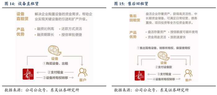 1)设备直租赁与售后回租赁组成公司主要租赁方式。设备直租赁是指公司用自有资金或在资金市场上筹措到的资金购进设备,直接出租给承租人。该方式适合资金不充足且亟需使用生产设备的客户;而售后回租赁指公司先行购买承租人所有的设备,再重新出租给承租人,并最终转移设备所有权。该方式利于客户盘活存量资产,资金使用方向灵活。